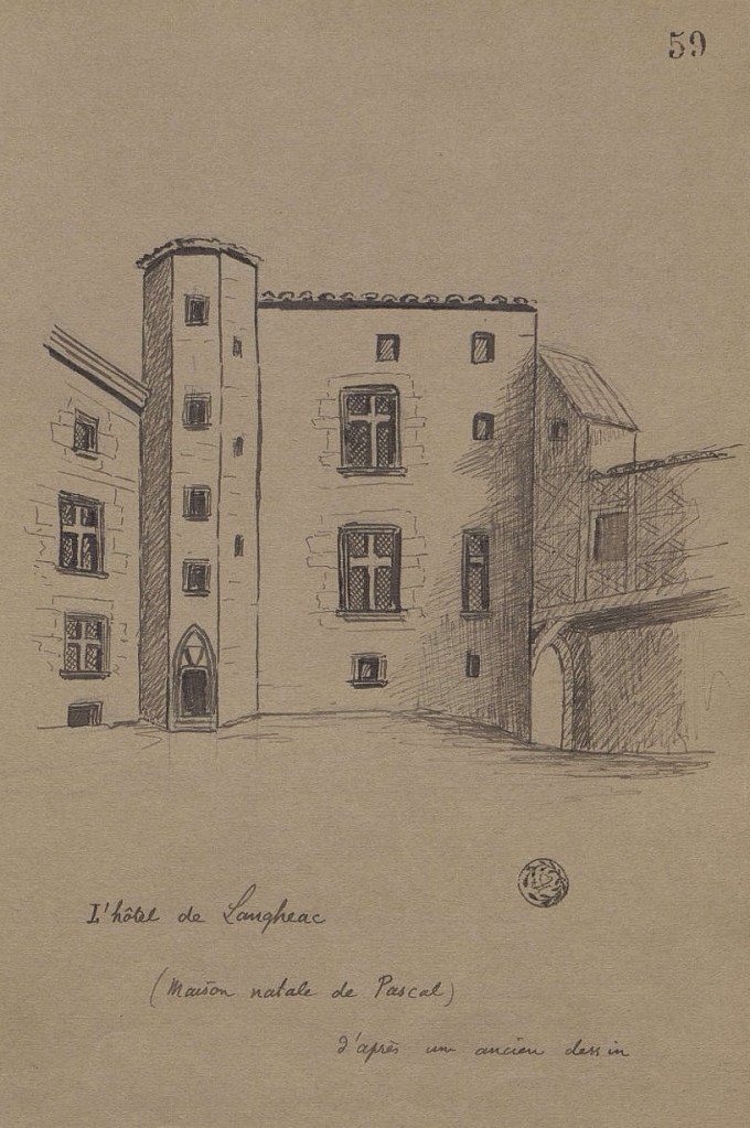 Blaise Pascal naît le 19 juin 1623 dans une bâtisse du haut Clermont, située rue Gras, et meurt le 19 août 1662, à Paris. Sa naissance le place sous le garde d’un père à la fois conseiller du Roi et mathématicien : Étienne Pascal. Ses exceptionnelles capacités se manifestent dans l’âge tendre par les « petites reparties qu’il fait tout à propos ». Aussi, son père, fait-il choix d’éduquer lui-même son esprit plutôt que d’en confier le sort aux professeurs des Collèges.